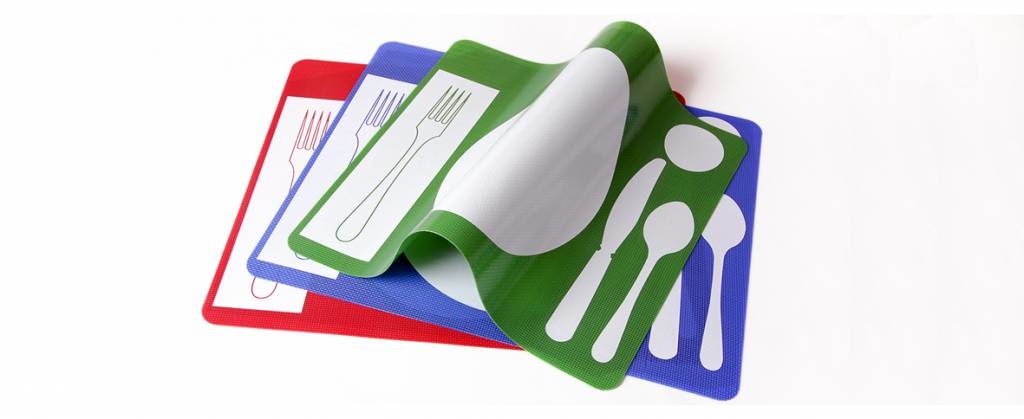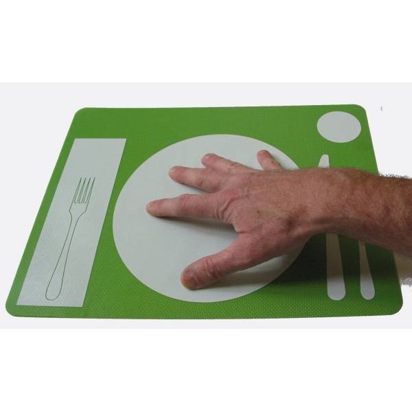 Antislip placemat met hoog contrast pictogrammen; blauw, rood of groen.