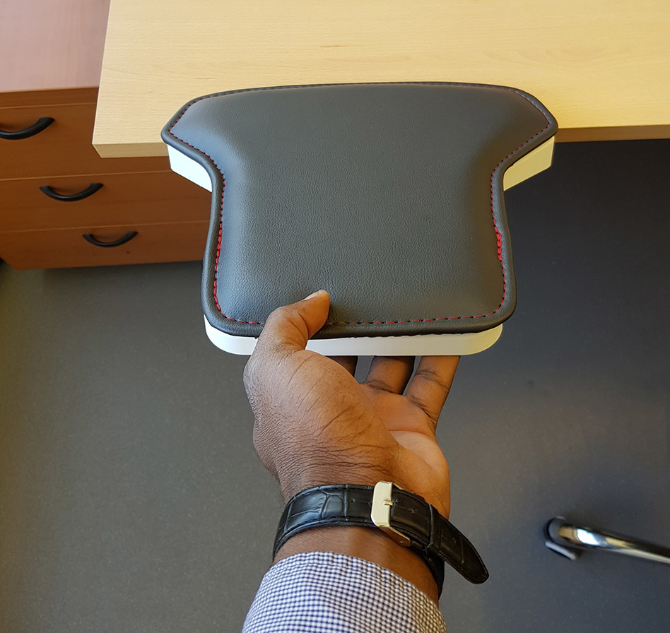 De raakvlakken zijn bekleed met Dycem® antislip, waardoor de steun bijzonder stabiel is. Bij gebruik van 2 steunen vervangt men de functie van een blad met buikuitsparing. Kunstlederen comfortkussen (optie): wordt bevestigd met een bandje en heeft een antislip onderkant. Zwart met rode stiksels.