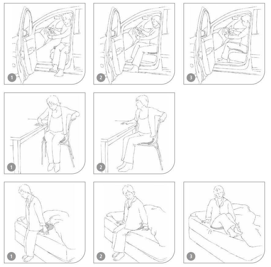De gebruiker zet zichzelf in het midden van de easy-turn. De gebruiker heft dan beide benen gelijktijdig of op één been per keer in het voertuig, waardoor het lichaam wordt gedraaid in de auto (de easy-turn is ook perfect om de gebruiker te draaien in het voertuig). Dit voorkomt onnodige spanning op het lichaam. Om af te sluiten, zwaait de gebruiker beide benen uit de auto, bij voorkeur in fasen, vóór het opheffen van zichzelf tot de staande positie.