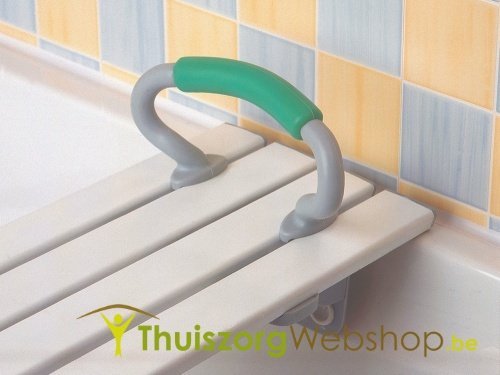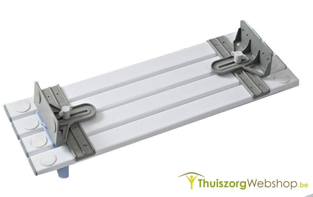 Badplank Savanah®, witte kunststoffen stroken met een grote drainagemogelijkheid. De 2 klemmen zijn afgerond en passen zich aan aan verschillende badvormen. Een handgreep met een antislip laag is afzonderlijk verkrijgbaar.