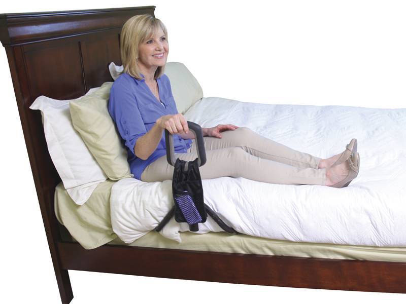 Compacte, handige transferhulp bij in en uit het bed komen; makkelijk te installeren en te verwijderen voor op verplaatsing. Inclusief opbergzakje om handige voorwerpen te bewaren. Met antislip handvat en gordel voor een veilige bevestiging aan het bedframe.