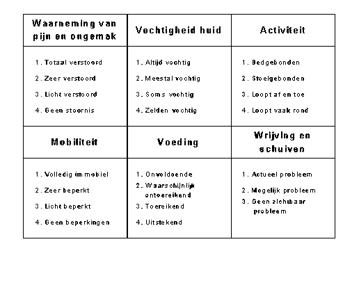 De bradenschaal houdt rekening met 6 factoren namelijk de lichamelijke toestand, de lichamelijke activiteit, de vochtigheidsgraad, de mobiliteit, de zintuigelijke waarneming en de wrijvingen en het schuiven. Op elke factor zal men vervolgens een score geven van 1 tot 4 en bij het wrijven en schuiven van 1 tot 3. Hoe hoger de score, hoe lager het risico op doorligplekken.