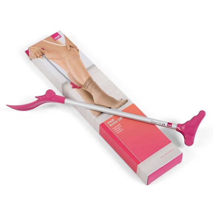 Compressiekousen uittrekken wordt gemakkelijk: met de medi Butler Off kunt u compressiekousen uittrekken in enkele seconden, zonder zware inspanning en zonder uw rug te belasten. De medi Butler Off ziet er uit als een schoenlepel met een lang handvat. De Butler Off is ook handig voor het aan- en uittrekken van schoenen.