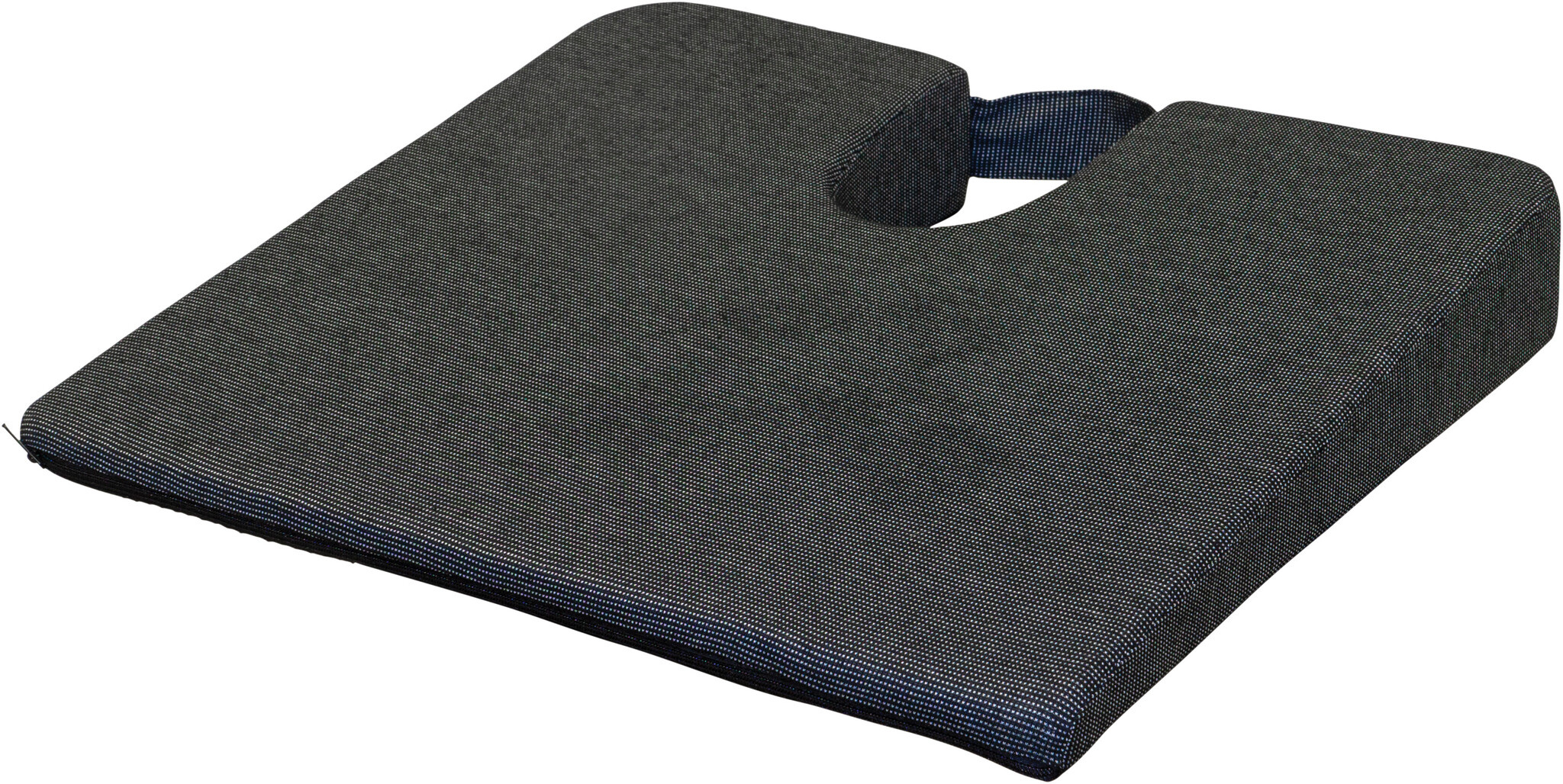 Het met zwarte houtskoolkatoenen keperstof beklede stuitbeenwigkussen is ontworpen om uw houding te verbeteren en verlichting te bieden aan mensen die last hebben van een gevoelig stuitbeen. De 11 gr. hoek wordt aanvaard als een optimale zithouding en correcte houding. Door de uitsparing aan de achterkant van het kussen kan het stuitbeen zonder druk worden opgehangen. De constructie van het kussen bestaat uit zowel standaardschuim als een royale laag van 2 cm traagschuim met hoge dichtheid voor meer comfort. Het Coccyx Wigkussen kan ook als vulling in een autostoel worden gebruikt.