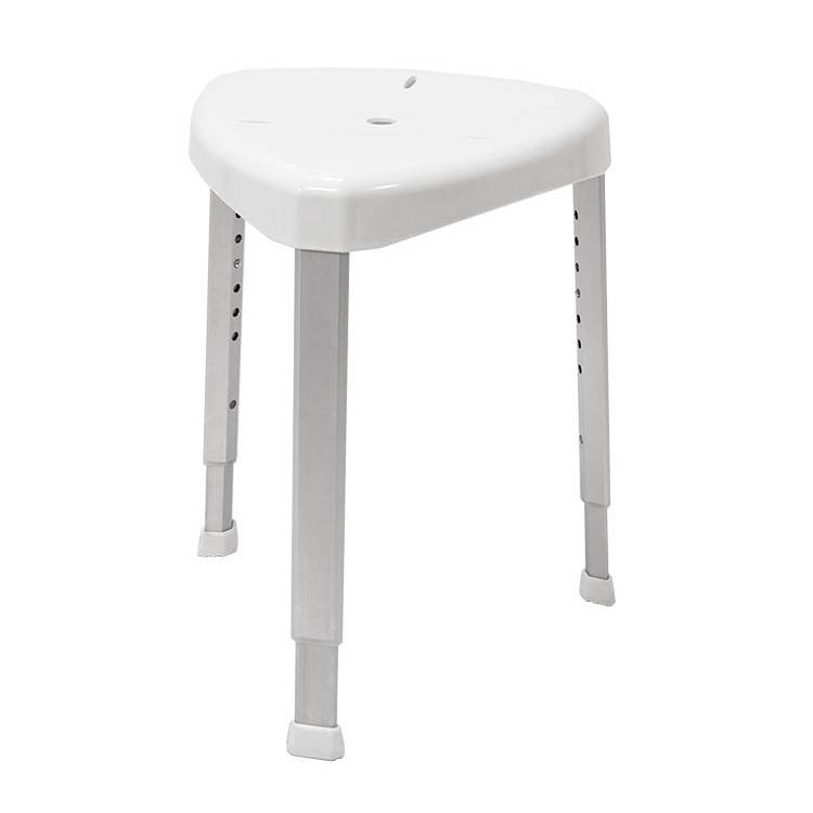 Handige oplossing in veel badkamers: het driehoekig model past in de hoek en laat maximale ruimte over voor de benen en voor eventueel andere bewoners. De zitting is geperforeerd en kan lichtjes schuin geplaatst worden om het rechtstaan te vergemakkelijken. Bestand tegen corrosie en voorzien van zachte antislip voetjes. Vervaardigd uit aluminium met kunststof zitting.