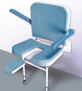 Comfortabel opklapbare douchestoel voorzien van armsteunen, gepolsterde zitting en rugleuning. Voorzien van een hygiënische uitsparing die kan opgevuld worden voor de functie van een volledige zitting.