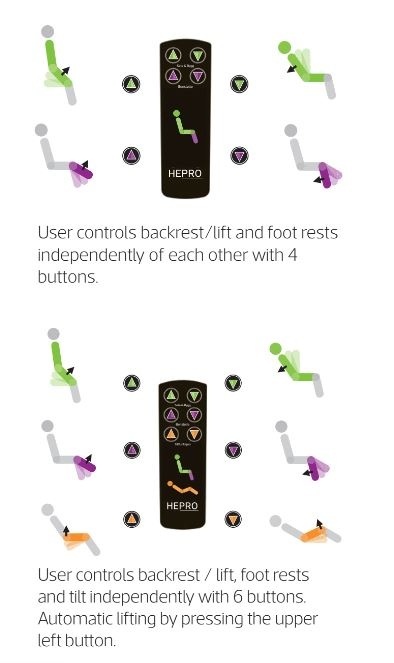 - Hepro aurora Standard: individuele bediening van rug- en voetdeel. Geschikt voor iedereen die een liftstoel nodig heeft.