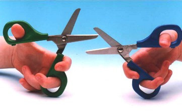 Bij Peta hebben alle linkse scharen een groen handvat, rechtse een blauw.