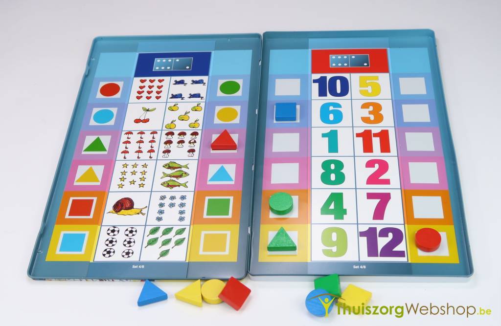 - 12 magnetische blokjes met geometrische vormen: driehoek, vierkant en rond in kleur rood, geel, blauw en groen