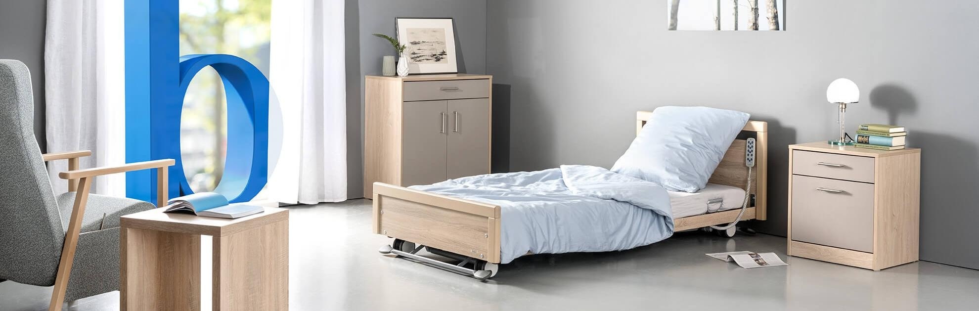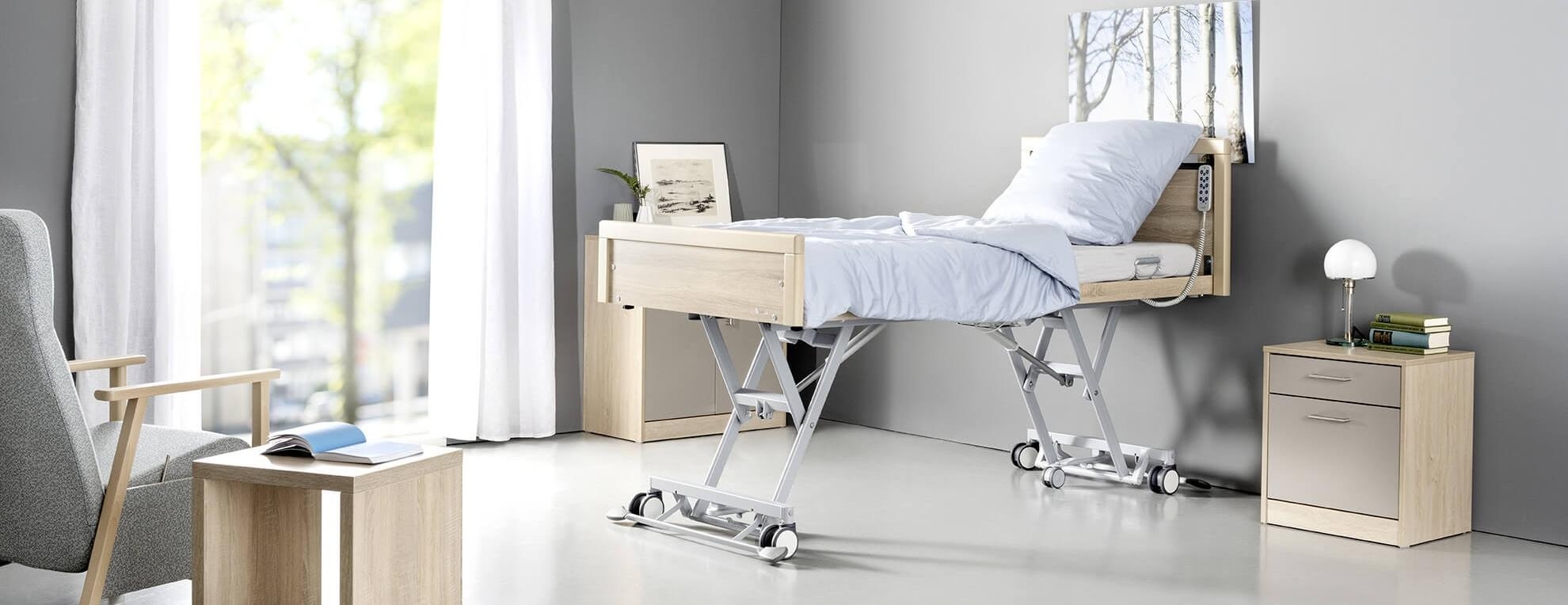 Verzorgingsbedden zo ver mogelijk laten zakken en optillen: Met deze combinatie stelt de bock floorline® nieuwe normen op het gebied van profylaxe tegen de gevolgen van vallen en verlichting van het werk in de dagelijkse zorg.