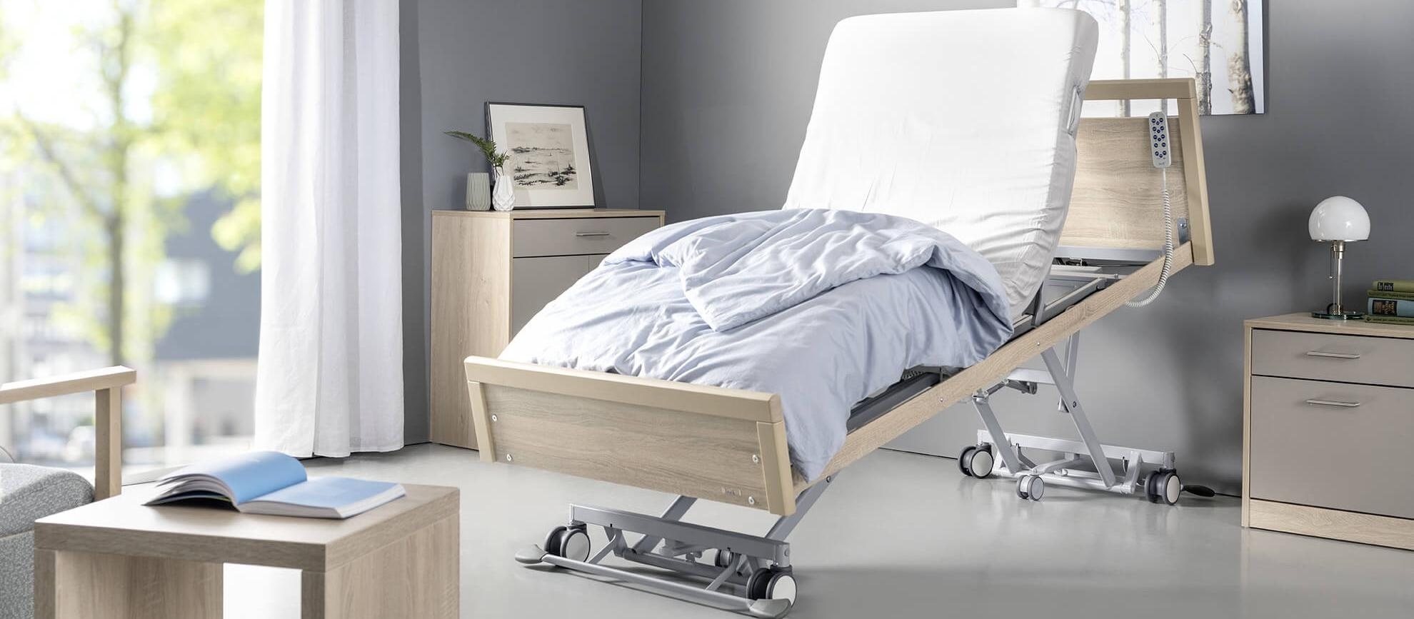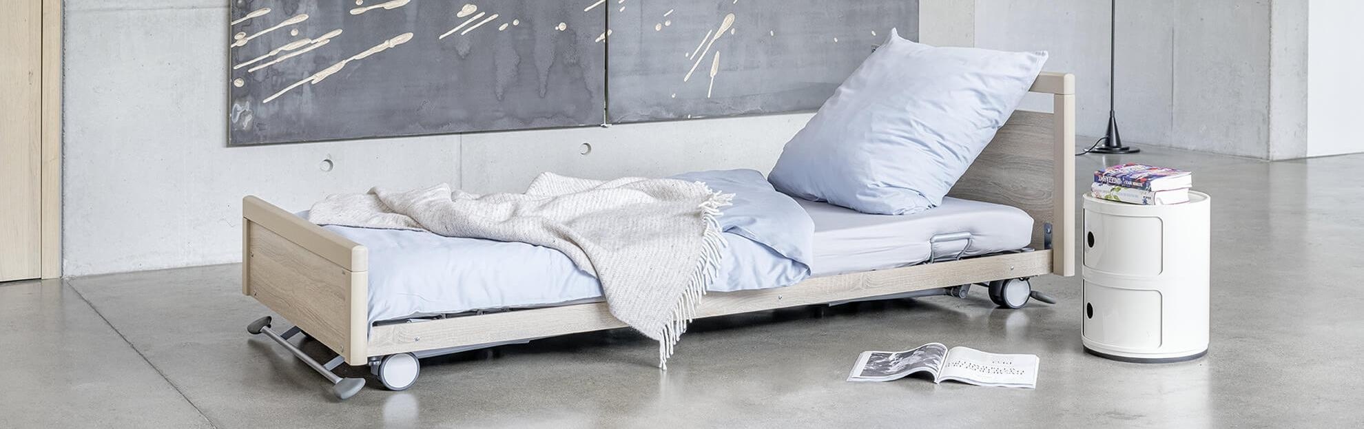 Verzorgingsbedden zo ver mogelijk laten zakken en optillen: Met deze combinatie stelt de bock floorline® nieuwe normen op het gebied van profylaxe tegen de gevolgen van vallen en verlichting van het werk in de dagelijkse zorg.