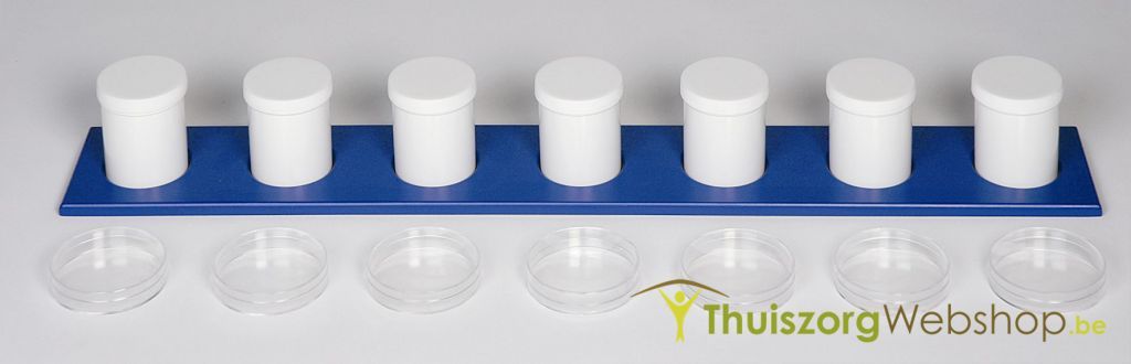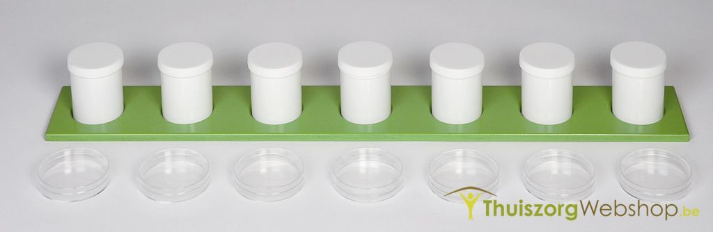 - 7 identieke doosjes: 5 x 7 cm met een dubbel deksel, die passen in een gelakte grondplaat van 62,5 x 9 cm