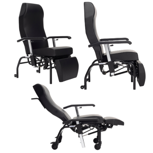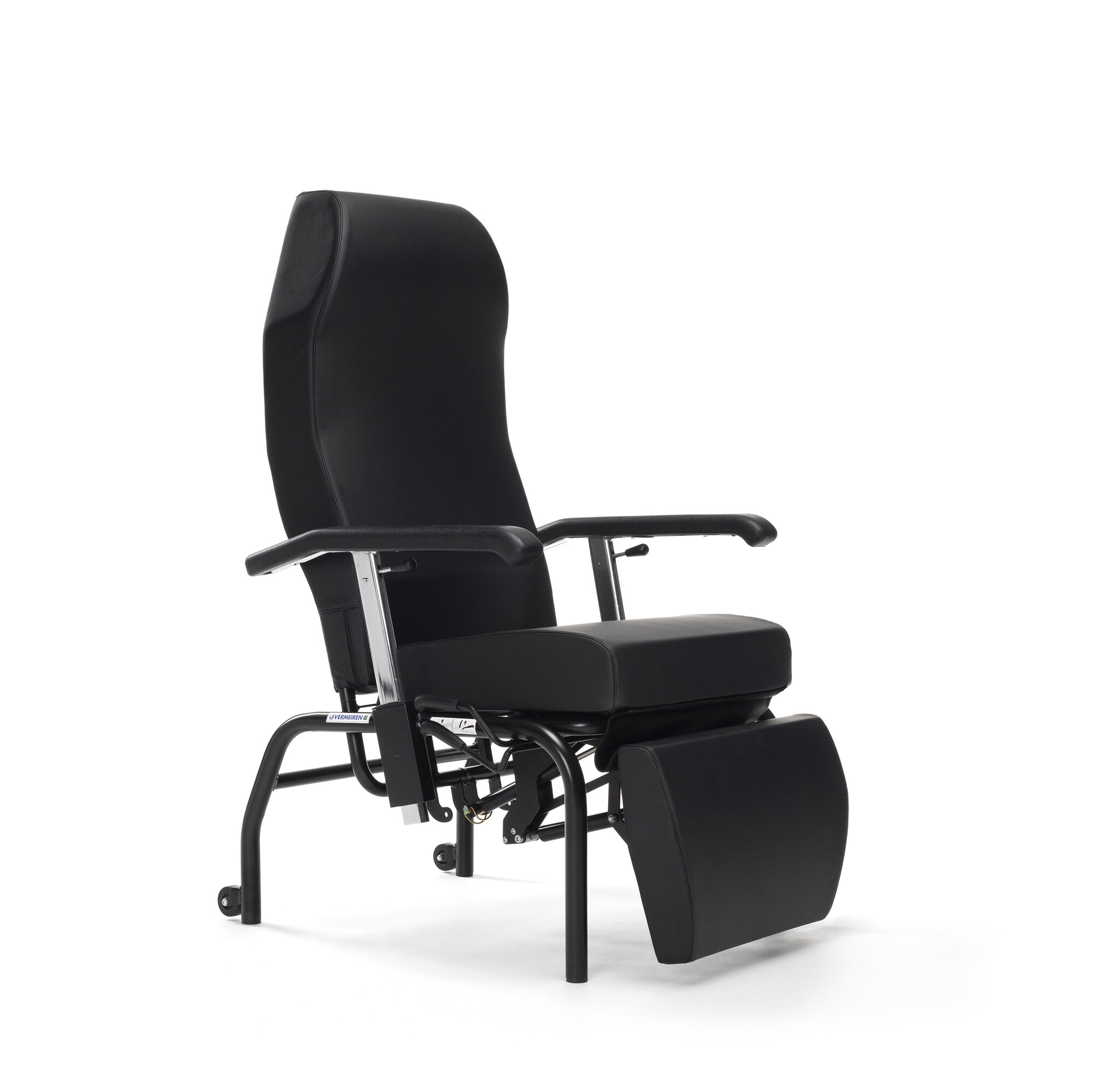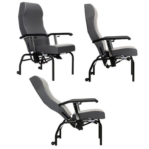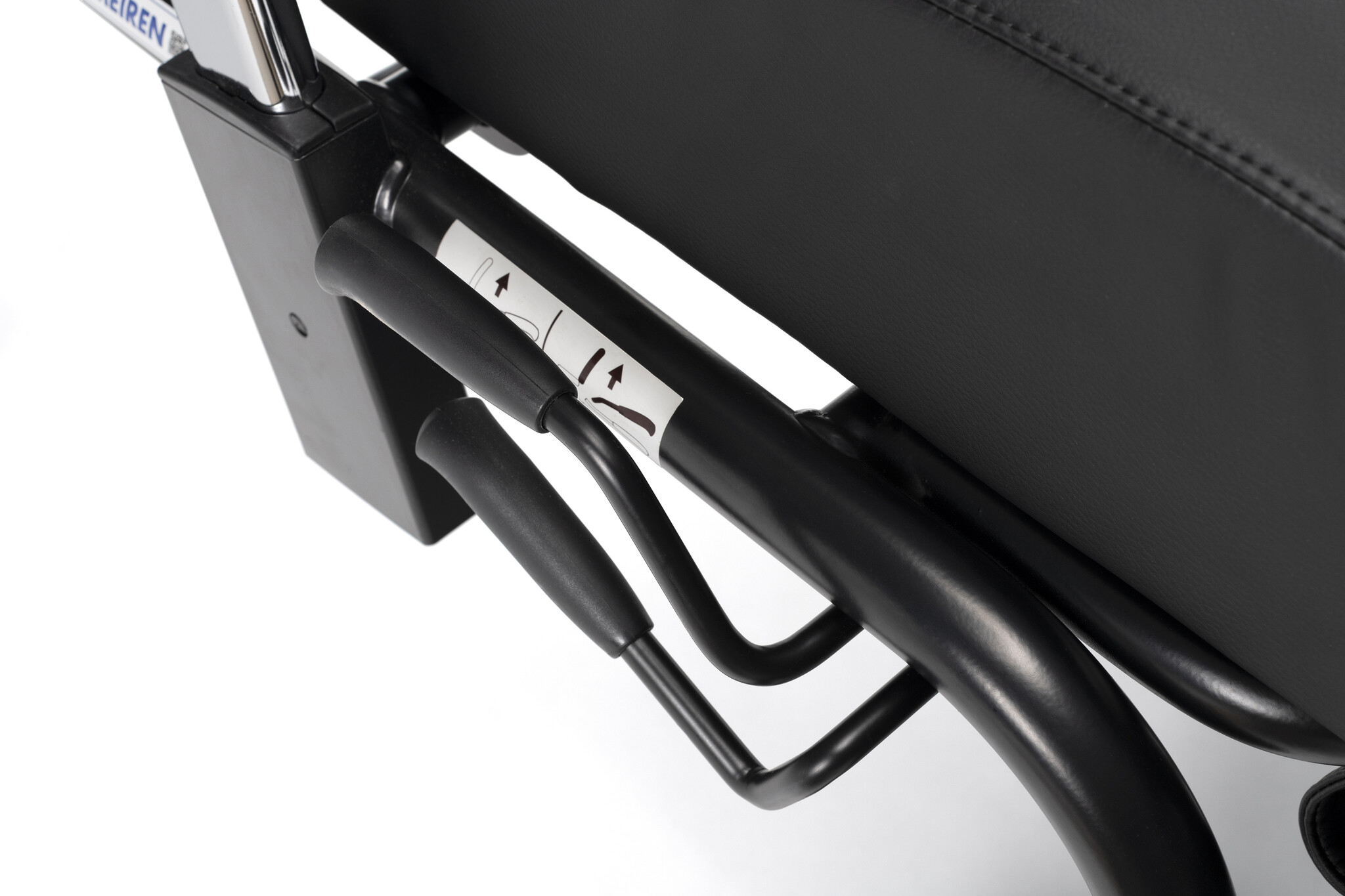 De geriatrische zetel Normandie XXL beschikt over een sterk, metalen onderstel dat de nodige stevigheid en stabiliteit biedt aan de gebruiker. Hij heeft een inclineerbare rug tot 45°, en de beensteun inclineert automatisch mee. Ook de armsteunen zijn in hoogte verstelbaar om een ideale houding aan te nemen.