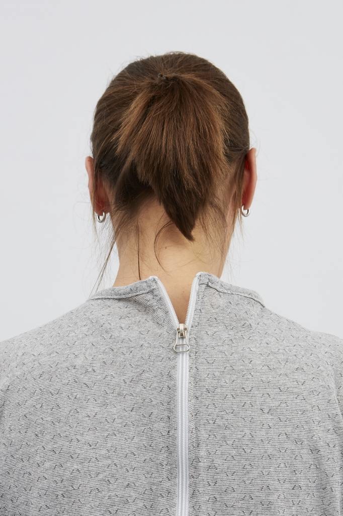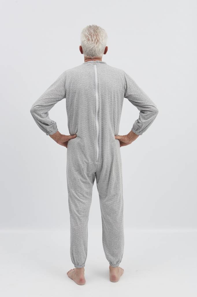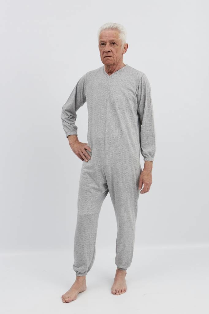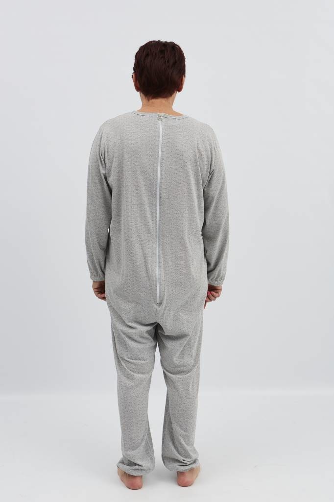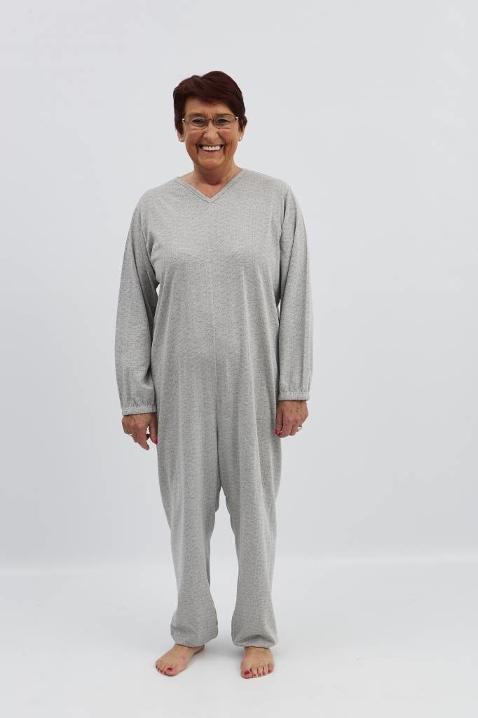 *Pyjama in 50/50 kat./pol. grijs, lange pijpen, lange mouwen, V-hals, ritssluiting op de rug.