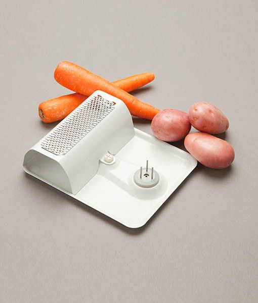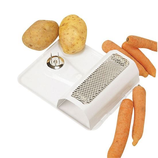Epoxy gecoat hulpmiddel voor het schillen en schrapen van groenten.De onderdelen kunnen gemakkelijk uit elkaar om alles gemakkelijk te reinigen. Bevat ook een set roestvrij stalen pinnen voor het fixeren.