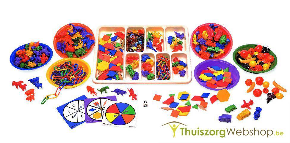 Met deze set kan men heel gevarieerde opdrachten bedenken om spelenderwijs kleuren en vormen te leren herkennen alsook leren tellen.