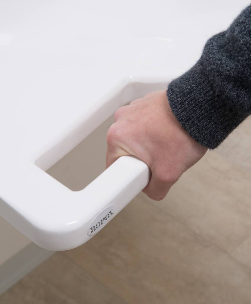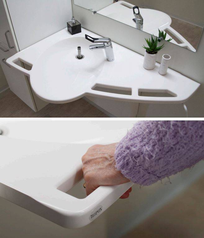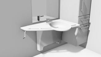 Zeer vlakke en in de hoogte verstelbare lavabo van het Deense Ropox. De lavabo is vooraan voorzien van ingebouwde handvatten en is gemaakt in één stuk, waardoor er geen naden zijn. Hierdoor is hij uiterst gemakkelijk en efficiënt te reinigen. Deze lavabo is ideaal als hoekmodel.