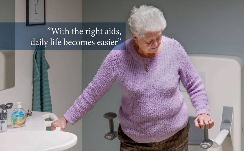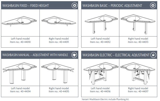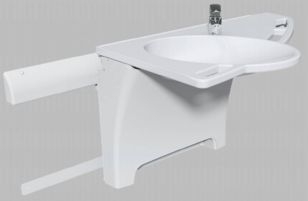 - Basic: de lavabo is gemonteerd op 2 muurhaken die traploos op een rail lopen. De hoogteverstelling gebeurt door het losdraaien van de 2 haken d.m.v. een inbussleutel, de lavabo op de gewenste hoogte te brengen en opnieuw te fixeren. Deze oplossing is vooral bedoeld bij 1 gebruiker, wanneer de hoogte niet frequent dient aangepast te worden. Een voordeel is de lagere kostprijs.