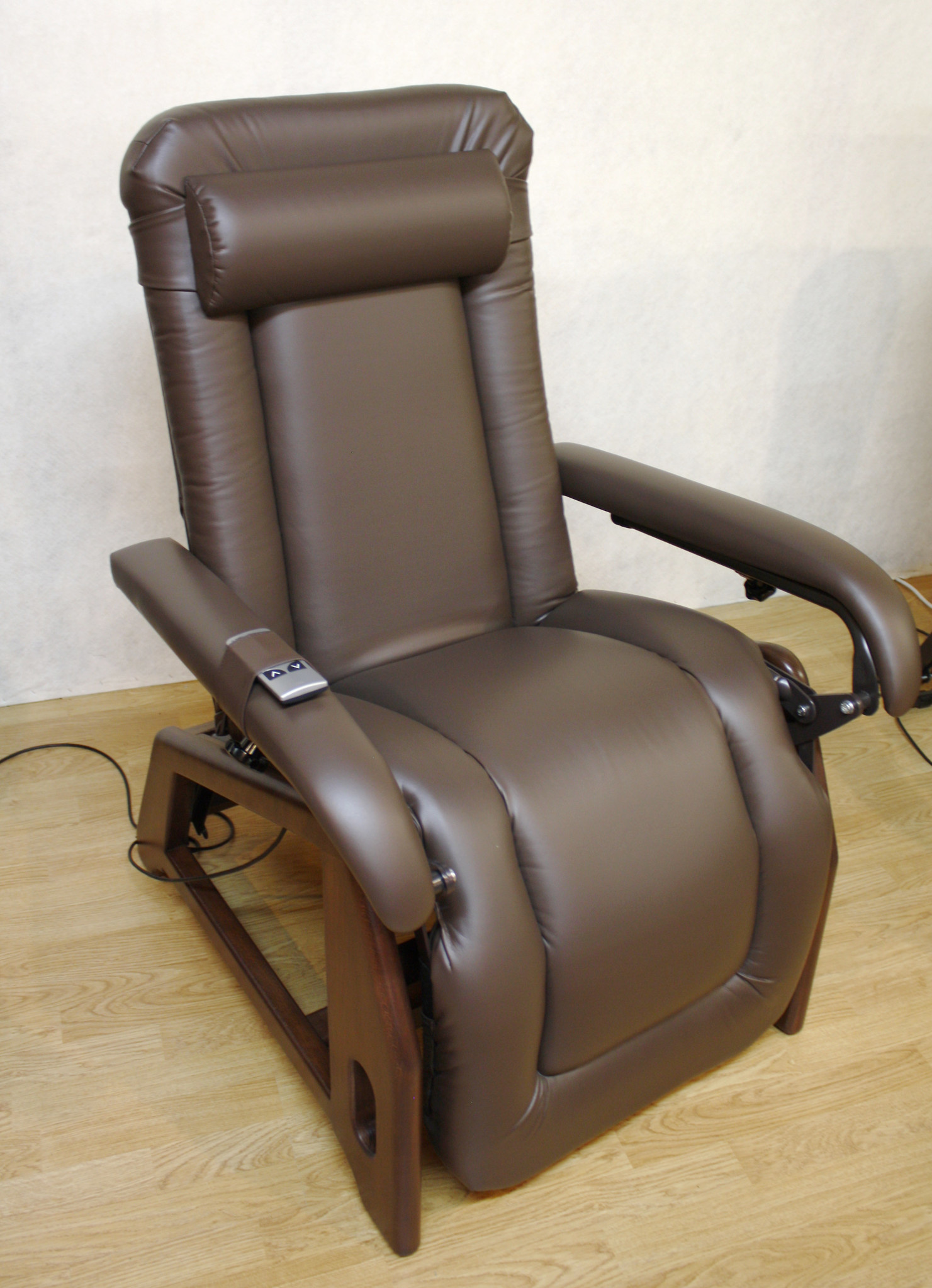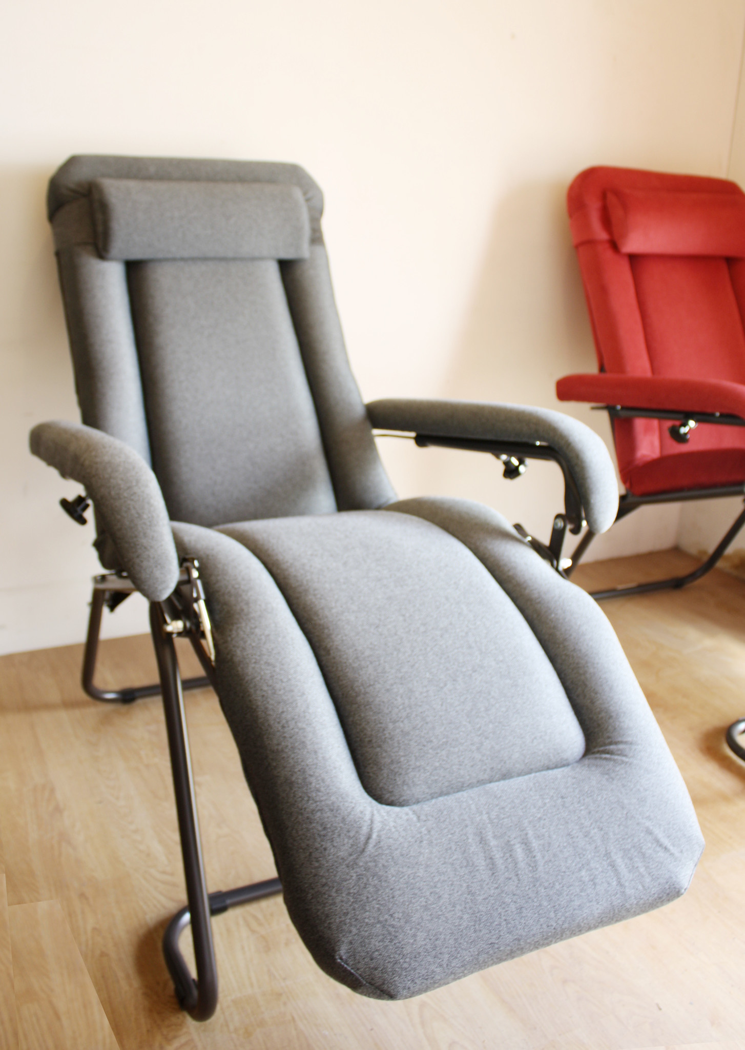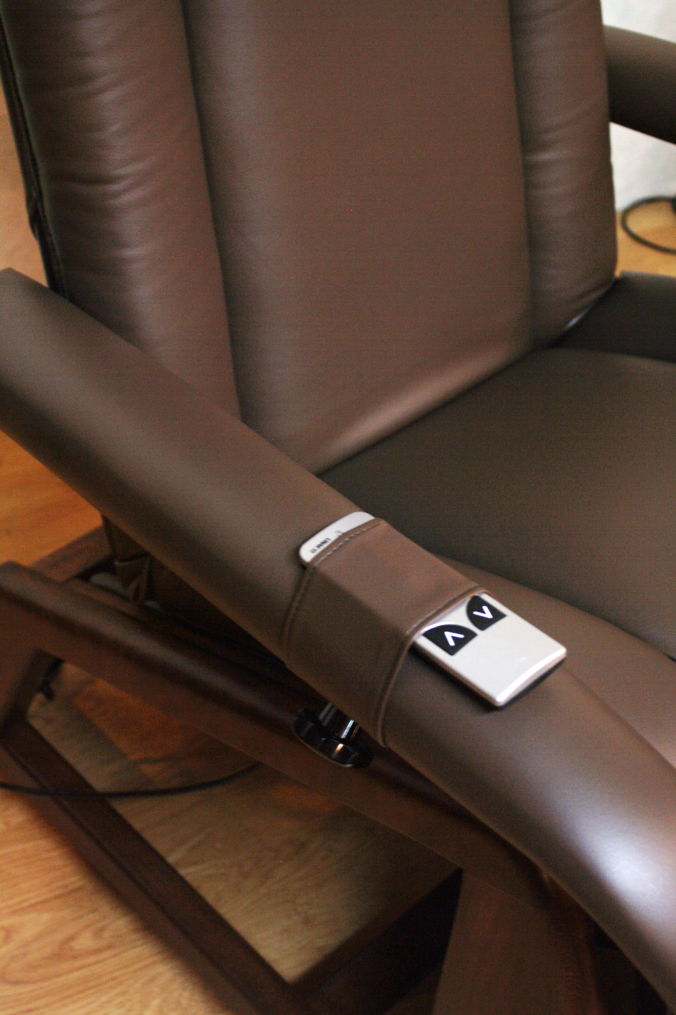 Als je met je rug naar achteren leunt, dan gaan de benen omhoog. De ergonomische zetels kunnen zowel manueel als met motor bediend worden (optie). Er zijn twee standen, omhoog of omlaag om het gemakkelijk te houden.