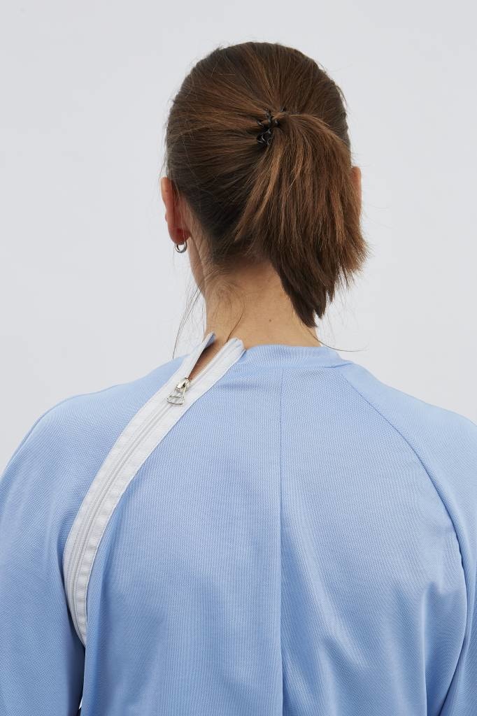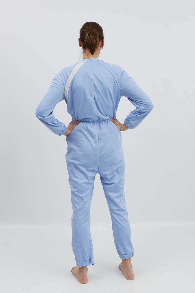 Licht blauwe pyjama met ritssluiting via de schouder naar de zijnaad en tussen de benen, elastiek in de taille