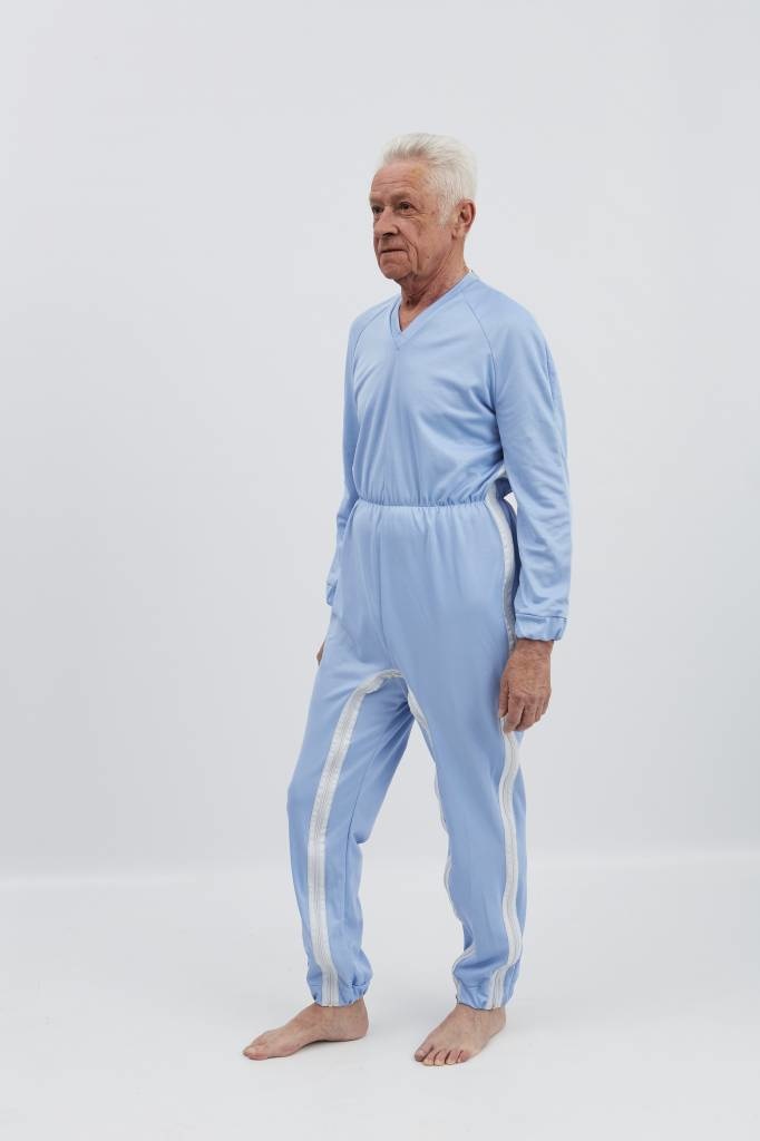 *Pyjama in 50/50 pol./kat. licht blauw antibacterieel (katoen aan de binnenzijde/polyester aan de buitenzijde), lange pijpen, lange mouwen, V-hals, ritssluiting via de schouder naar de zijnaad en tussen de benen, elastiek in de taille.