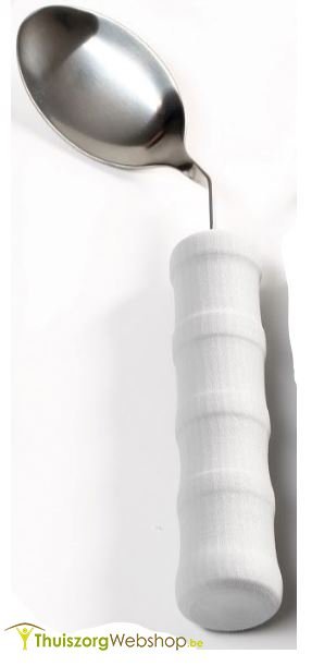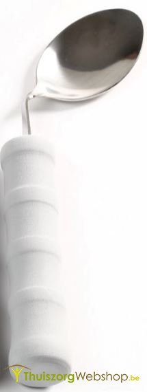 Gebogen versie van de extra lichtgewicht bestekken. Schuim handvatten, type gesloten cel. Speciaal kantelmes 90°, ook geschikt voor éénhandig gebruik. Lepel en vork zijn 40° gebogen, deze hoek kan heel lichtjes bijgesteld worden.