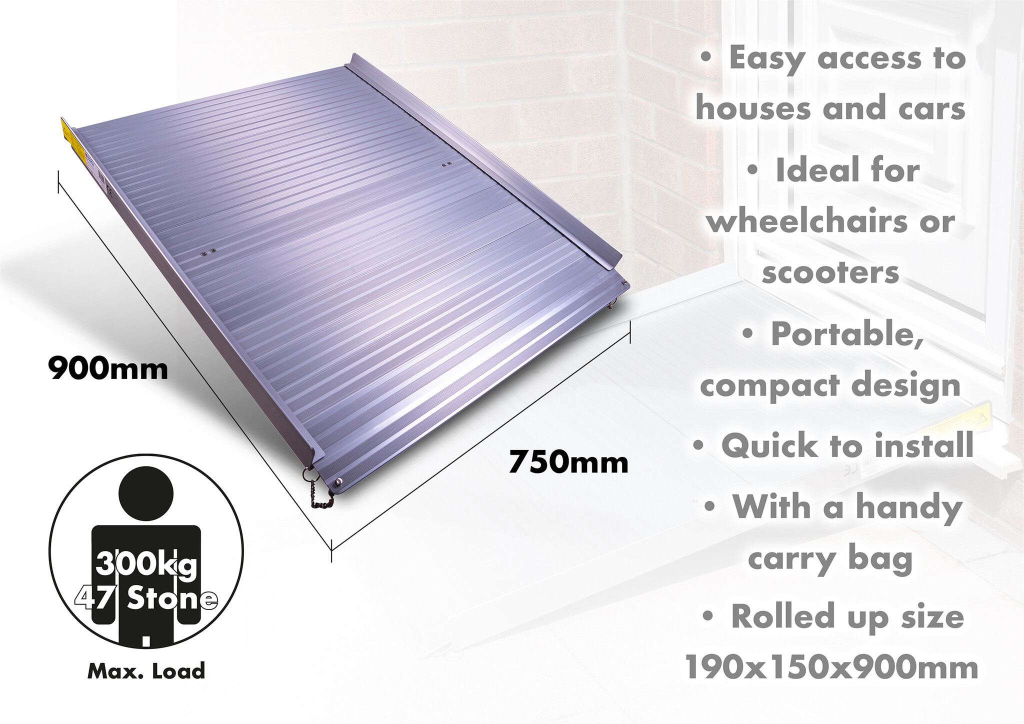 Met deze compacte oprolbare aluminium oprit kunnen rolstoel-, scootmobiel- en rollatorgebruikers veilig en stabiel toegang krijgen tot huizen, auto's en tuinen. De oprit geeft semi-permanente toegang en kan zo lang als nodig op zijn plaats blijven staan, eenvoudig oprollen en verplaatsen wanneer dat nodig is. Wanneer de oprijplaat niet wordt gebruikt, kan deze snel en eenvoudig worden opgevouwen en kan worden opgeborgen en vervoerd in de meegeleverde draagtas met handvatten. U hoeft niet te investeren in dure bouwwerkzaamheden en permanente opritten. Deze aluminium oprit van 3ft heeft een maximaal laadgewicht van 300 kg.