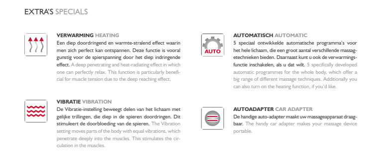 5 speciaal ontwikkelde automatische programma’s voor het hele lichaam, die een groot aantal verschillende massagetechnieken bieden. Daarnaast kunt u ook de verwarmingsfunctie inschakelen, als u dat wilt.