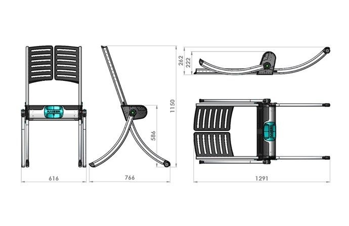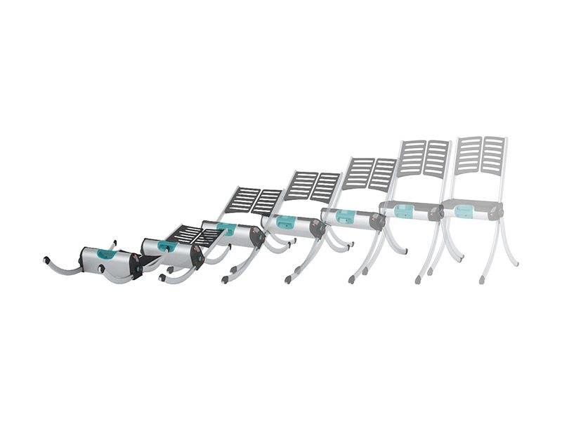 - Het zitvlak van het toetstel wordt onder de knieën van de gevallen persoon geschoven, waarna de poten en rugleuning in elkaar geklikt worden.