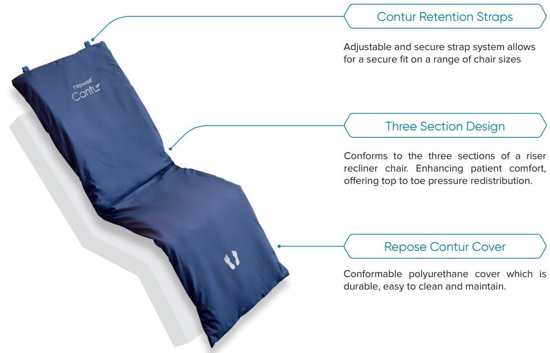 De Repose Contur Acute vermindert de druk ter hoogte van het rugvlak, het zitvlak en het beenvlak van een relaxzetel met meer dan een derde. Gebruikers appreciëren ook het comfort van de Repose Contur Acute. Het systeem wordt met linten vastgemaakt aan de zetel.