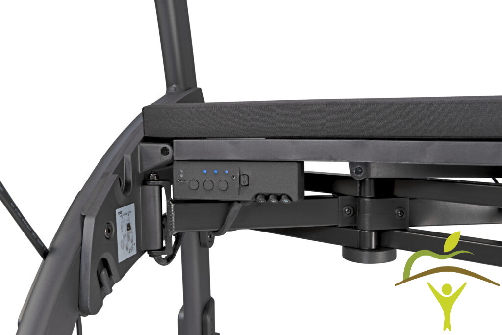 Deze rollator gebruikt verschillende signalen om u weer op gang te helpen. Deze signalen worden in gang gezet door een knop bovenaan het handvat (zie detail foto). Elk signaal is regelbaar en kan u afzonderlijk in- en uitschakelen.