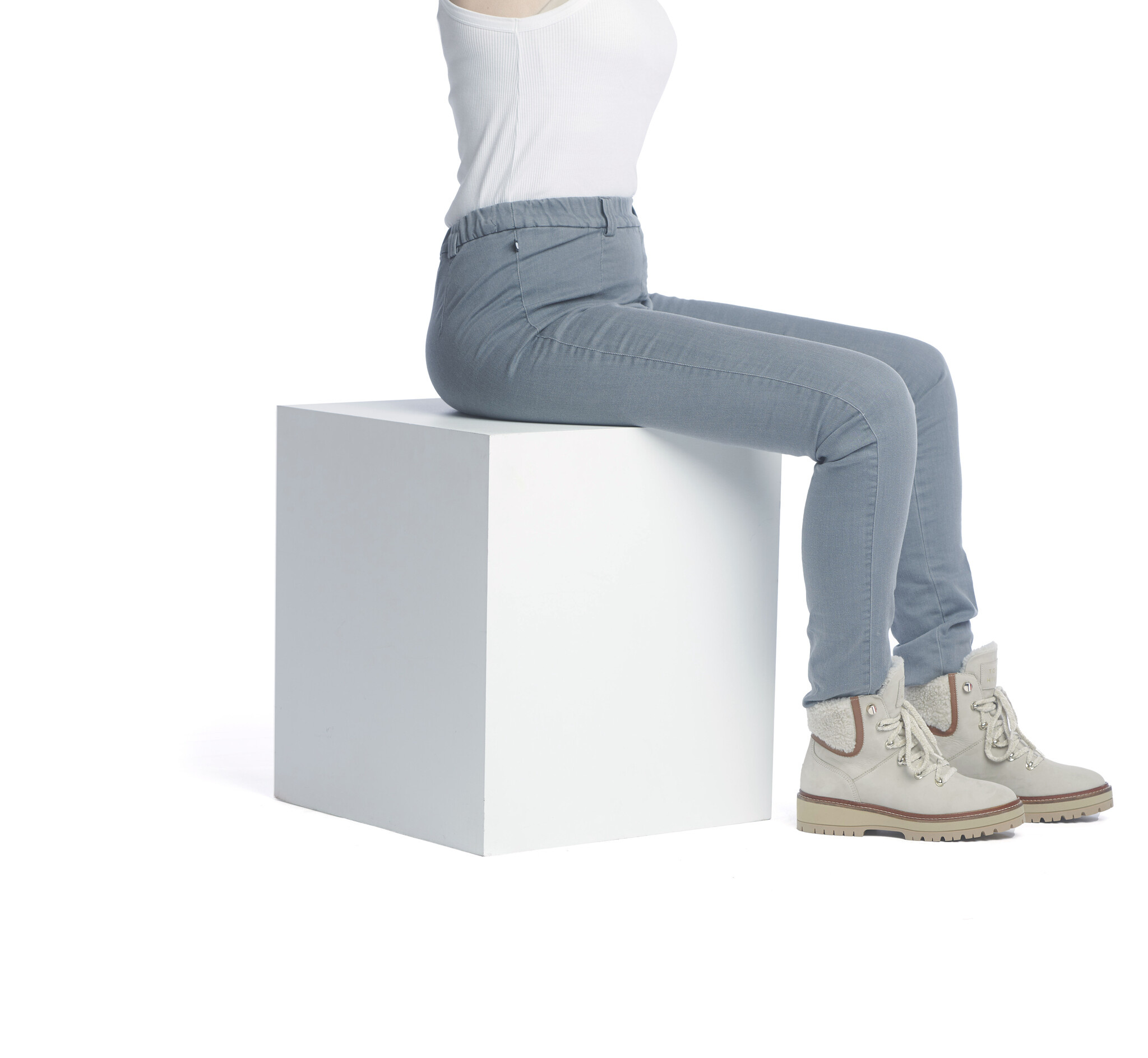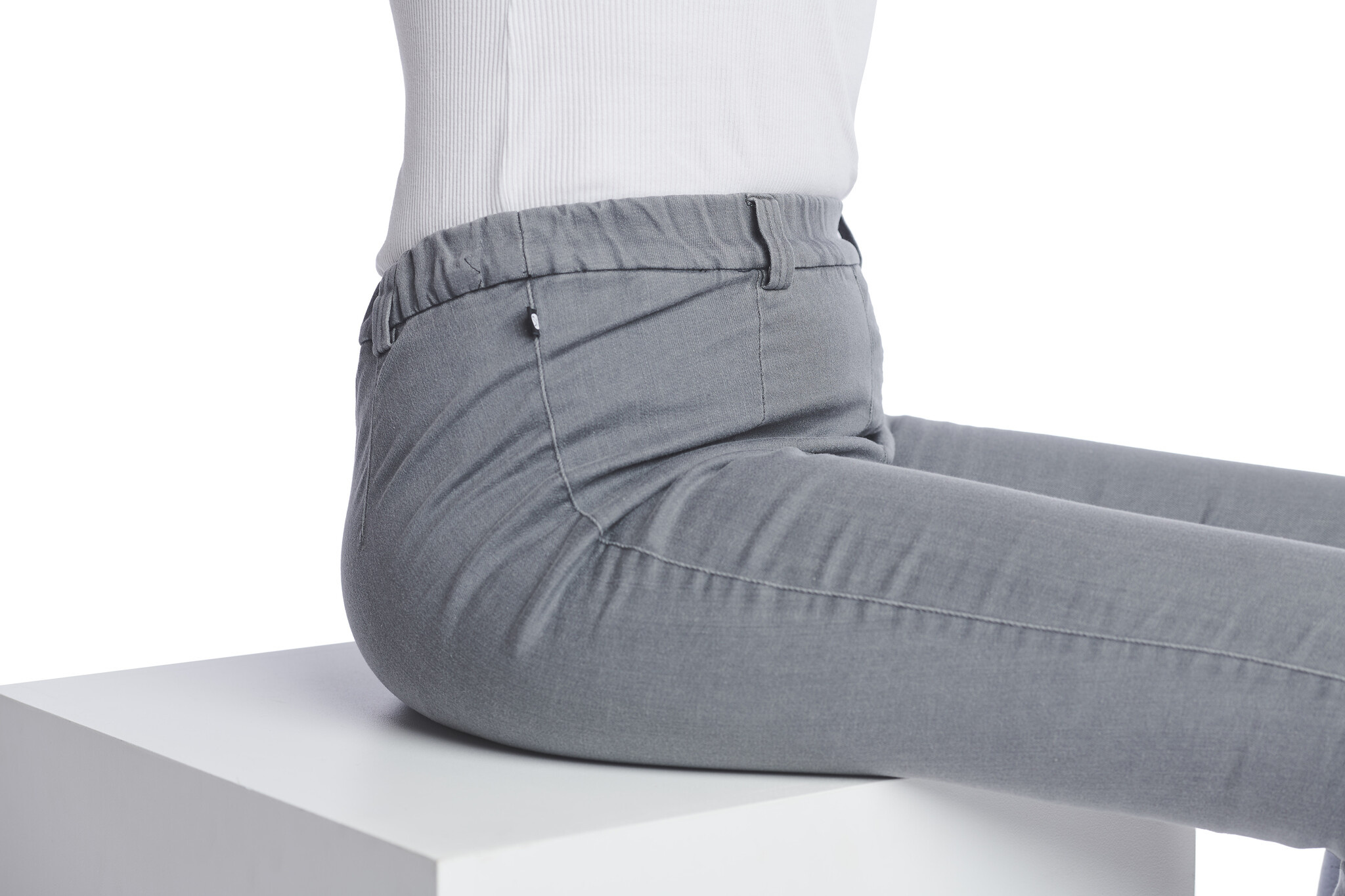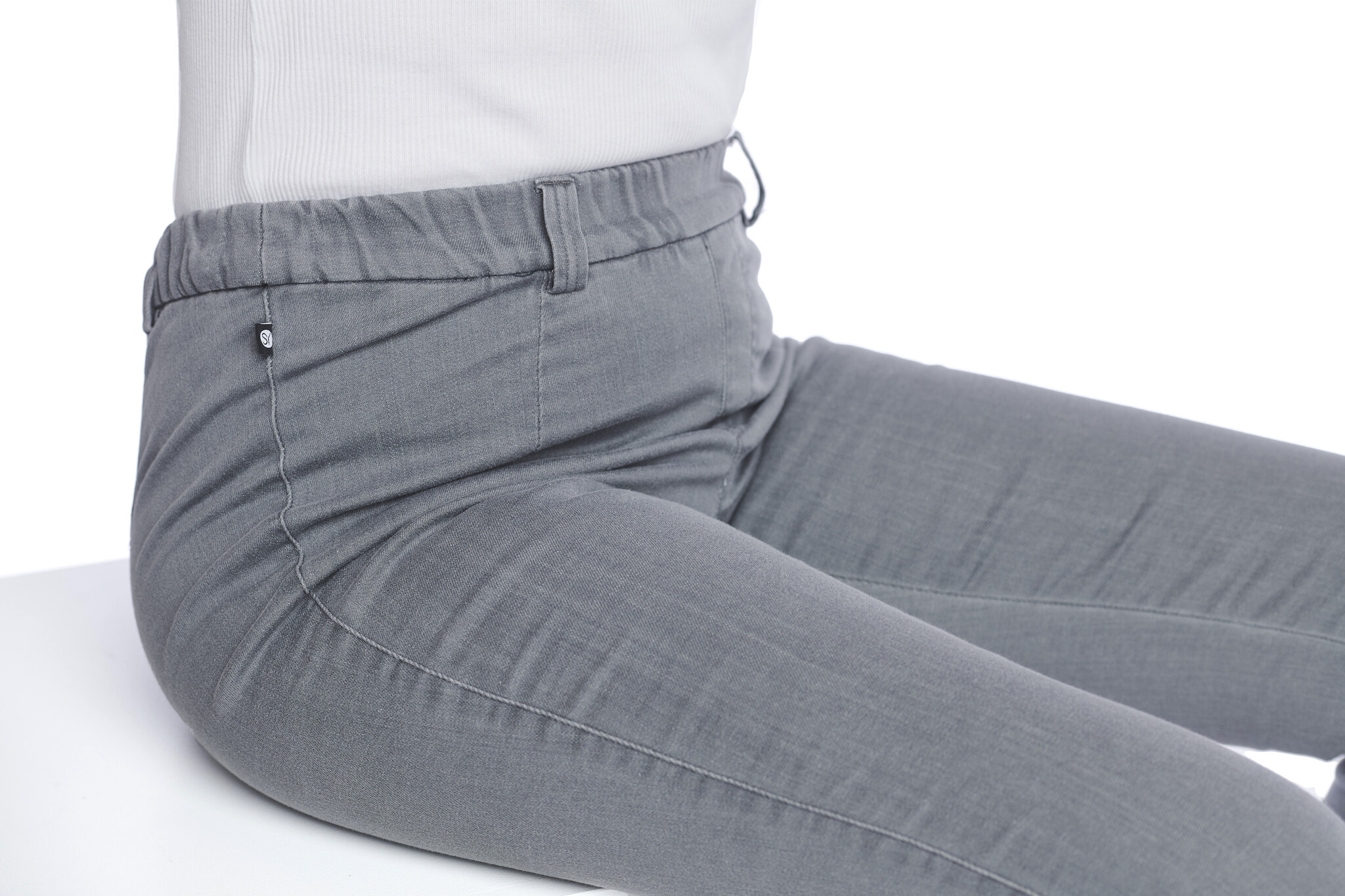Klassieke dameszitbroek in zachte grijze jeans met een uiterst hoog draagcomfort voor rolstoelgebruikers.