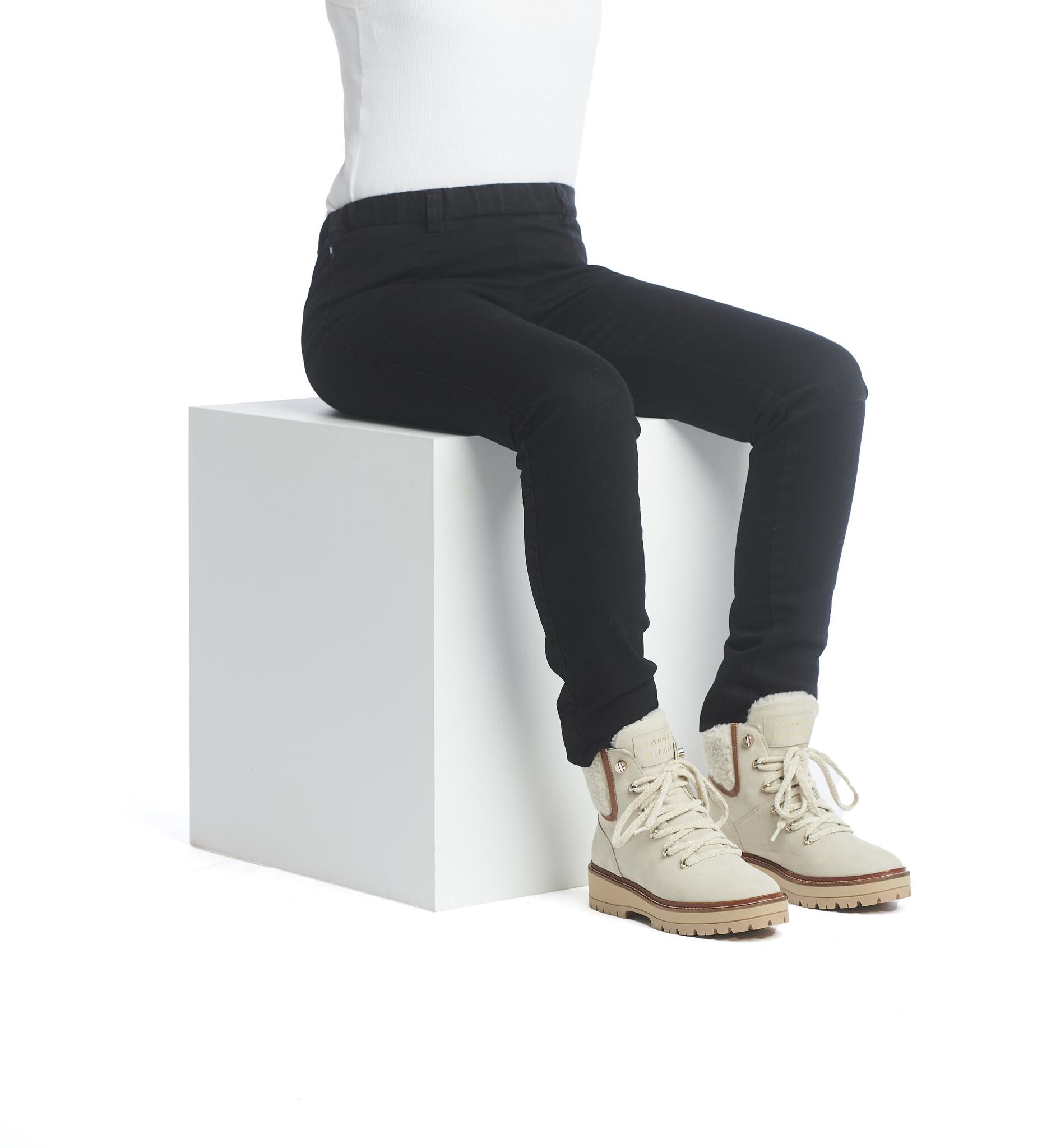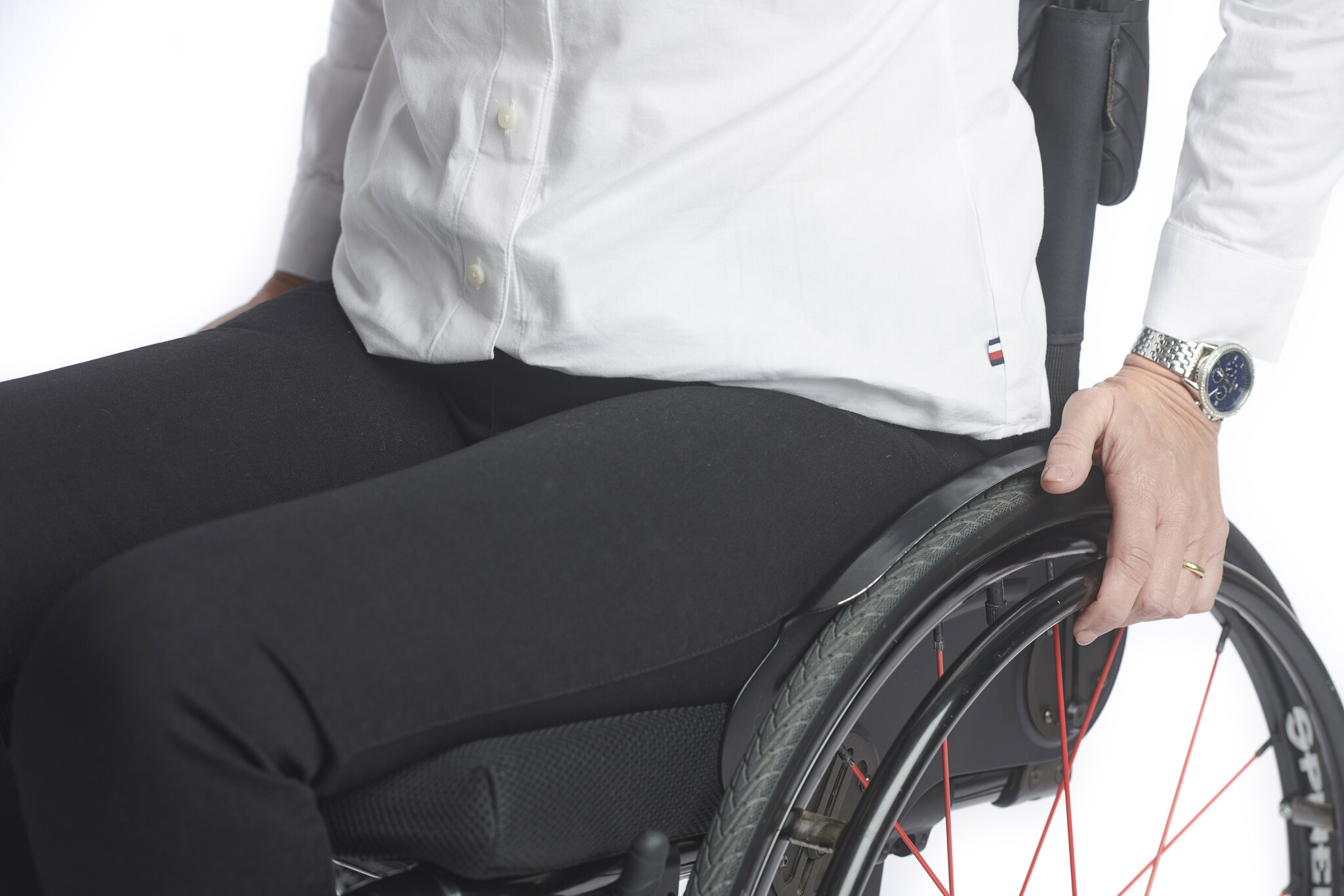 Klassieke dameszitbroek in zachte zwarte jeans met een uiterst hoog draagcomfort voor rolstoelgebruikers.