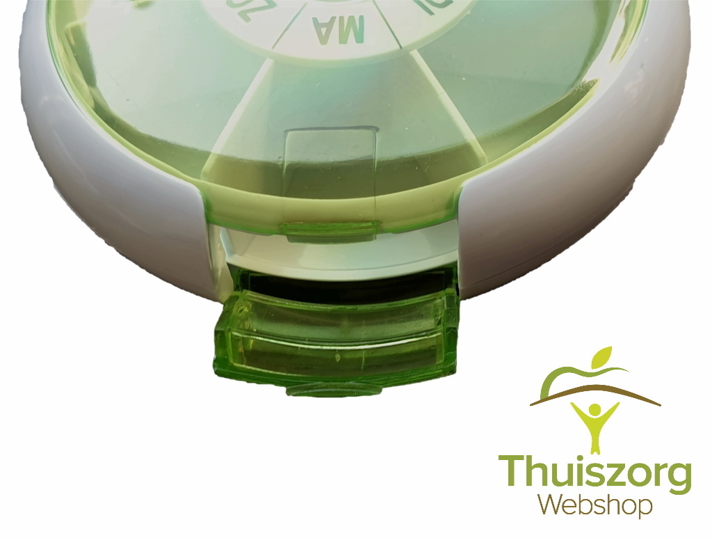 Deze handige ronde medicijndoos laat met één druk op de knop het doosje naar het volgende pillen vakje gaan.