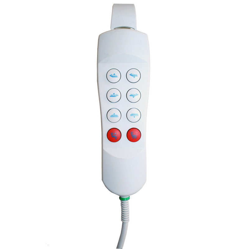 Het Rotoflex bed wordt bediend met één bedrade afstandsbediening, waarvoor geen batterijen nodig zijn. Deze afstandsbediening is zo eenvoudig als maar kan. Er zijn slechts 8 knoppen, en elke knop heeft een zelfverklarend pictogram. Veel eenvoudiger kan het niet.