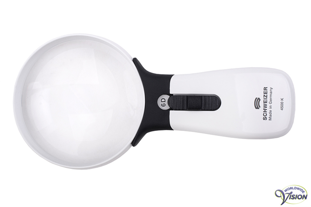 Schweizer ERGO-Lux MP Mobile LED 164062 6D draagbare lifestyle handlichtloep met SMD LED-verlichting van 4500 K en twee lichtintensiteiten, asferische lens van 100 mm, vergroot 1.5 maal, kleur wit/donkergrijs, incl. bescherm-/schoonmaakhoesje, excl. 3 AAA batterijen.