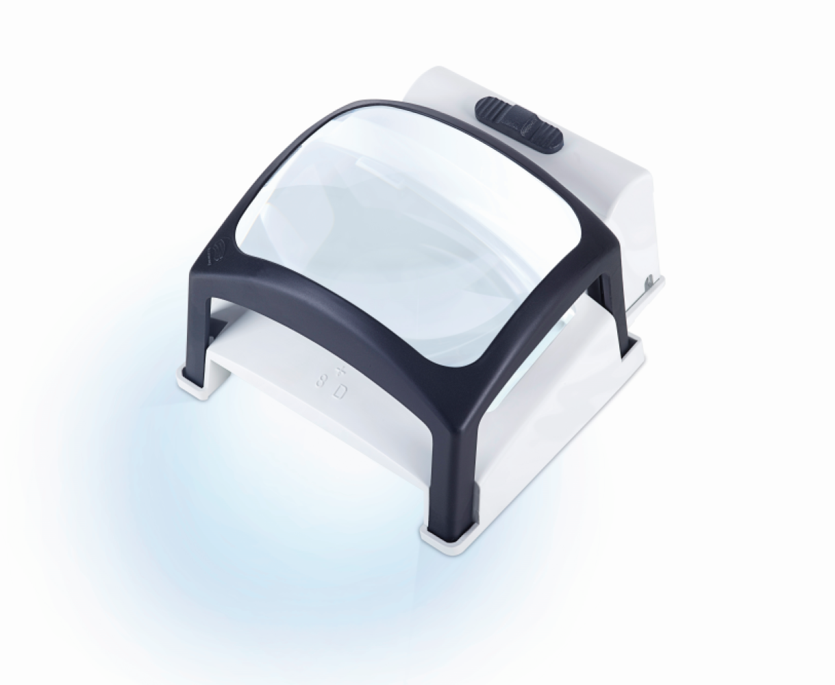 De loep met ’s werelds grootste gezichtsveld van 100 x 50 mm, bij een totale vergroting van ca. 14 Dpt (8D + 6D, dit is een vergroting van 4,5 x). Gelijkmatige en zeer heldere verlichting over het volledig te bekijken oppervlak door 3 SMD LED’s. Een solide standloep: goed voor binoculair gebruik, eenvoudig krantenkolommen mee te lezen en de loep is op een ergonomische manier gekanteld. Werkt op batterijen.