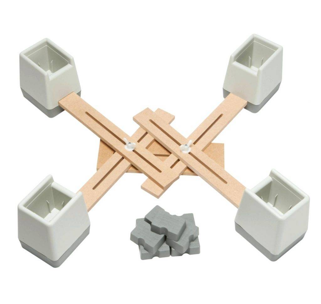 De 4 verhogers zijn met een dubbel kunststof kruis verbonden voor extra veiligheid. Men kan de hoogte kiezen door het inbrengen van kleine afstandshouders: 7,5; 9,5 of 11,5 cm. Het kruis kan tot 91 cm uitgeschoven worden.