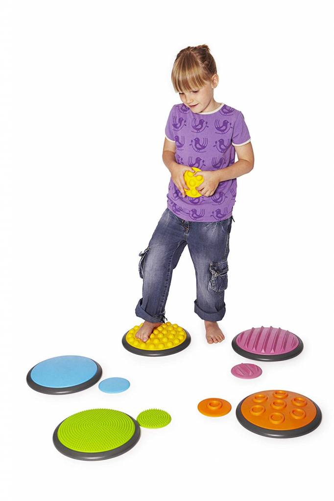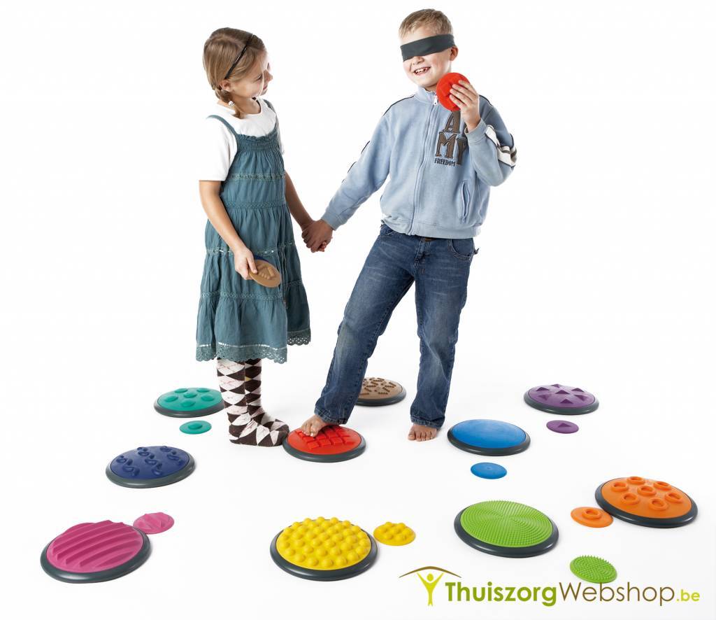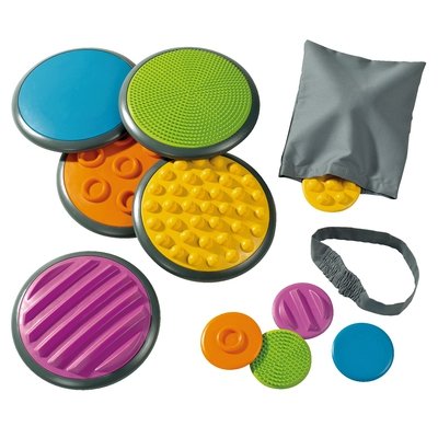 2 groottes: 11 cm Ø voor in de hand en 27 cm Ø voor op de grond. Van elke grootte zijn er 5 verschillende structuren, elk met hun eigen kleur. Gemaakt van aangenaam aanvoelende rubber. Geschikt voor proprioceptietraining: men kan bv. geblinddoekt de kleine handschijf in de hand geven en met de blote voeten de bijhorende voetschijf zoeken, of omgekeerd.