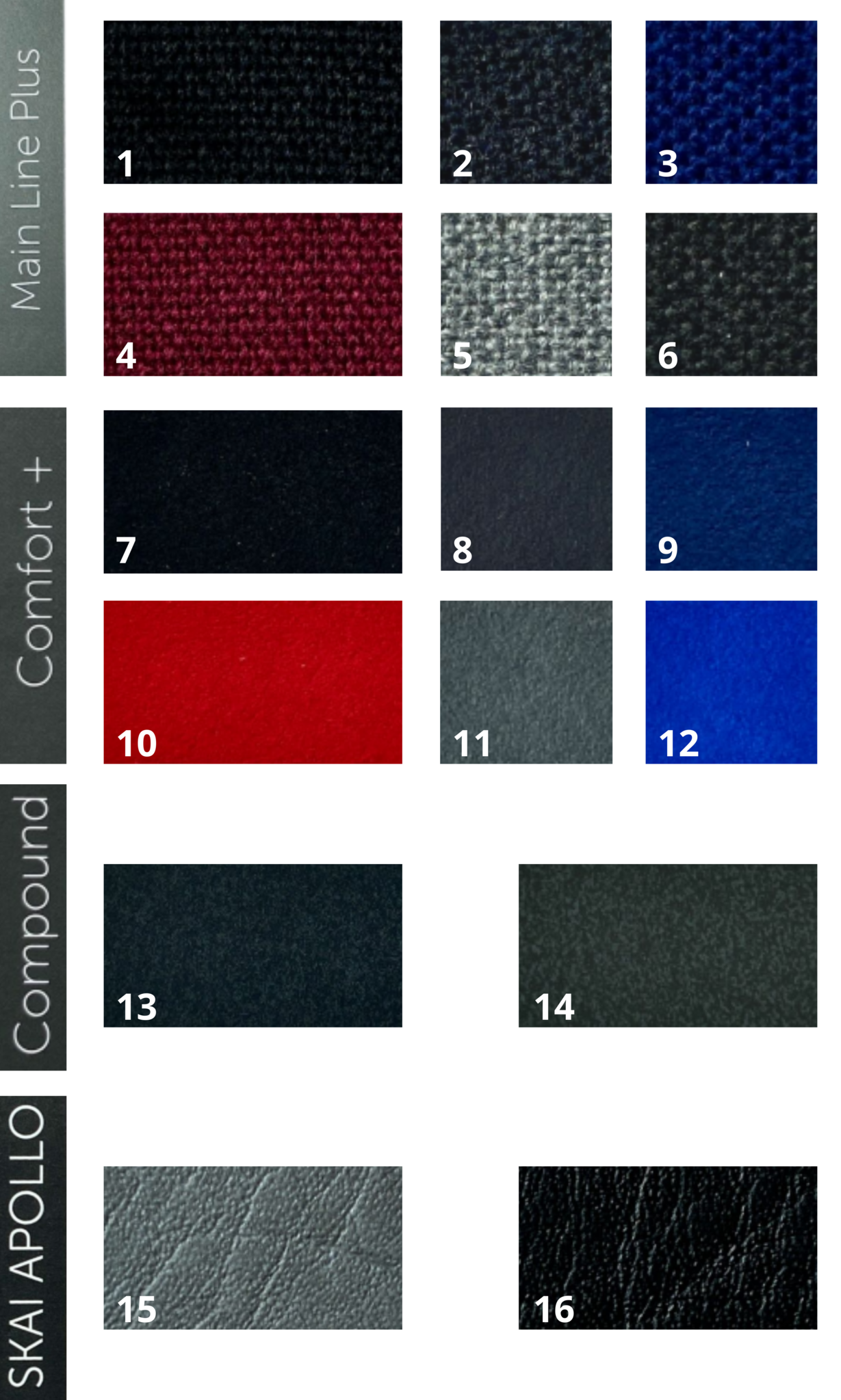 - De kleuren hieronder zijn standaardkleuren. We kunnen echter alle kleuren leveren hieronder vermeldt. Er kan een extra toeslag en langere levering worden berekend door een andere bekleding te kiezen dan standaard.