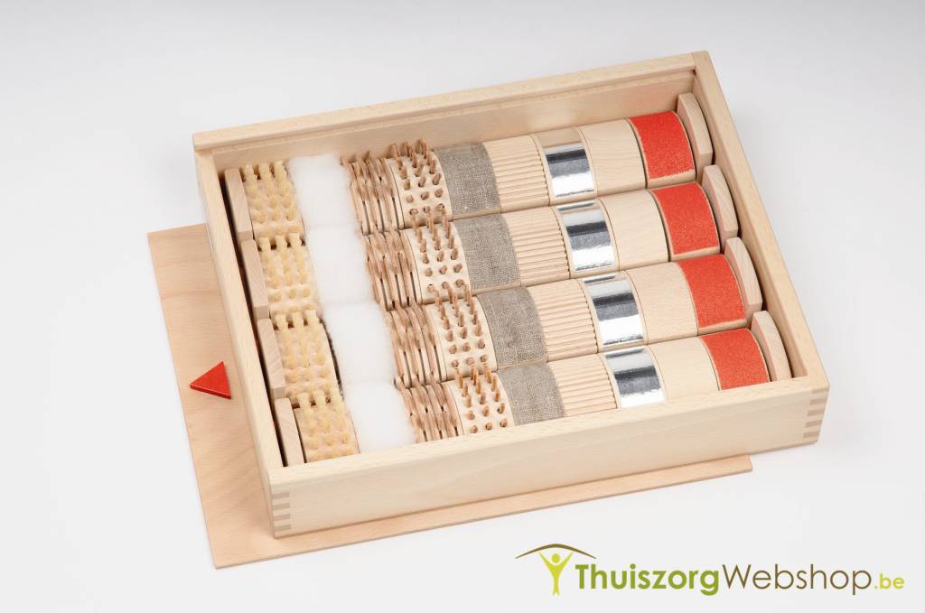 In een beukenhouten doos zitten 2 of 4 sets van elk 9 voelelementen (5,5 x 3 cm): o.a. linnen, aluminium, leder, gummi, sisal...