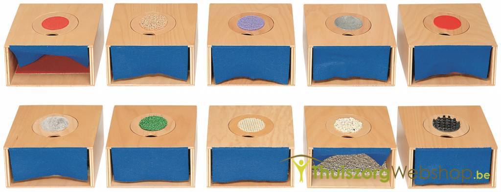 - 10 houten boxen (18 x 19 x 11 cm) waarin verschillende materialen zitten zoals artificieel gras, rooster van pijpenrager, stevig vastgelijmde kiezelsteentjes, plastieken noppen, schuurpapier, kurk, schuimrubber, metaal, veilig plexiglas en stof