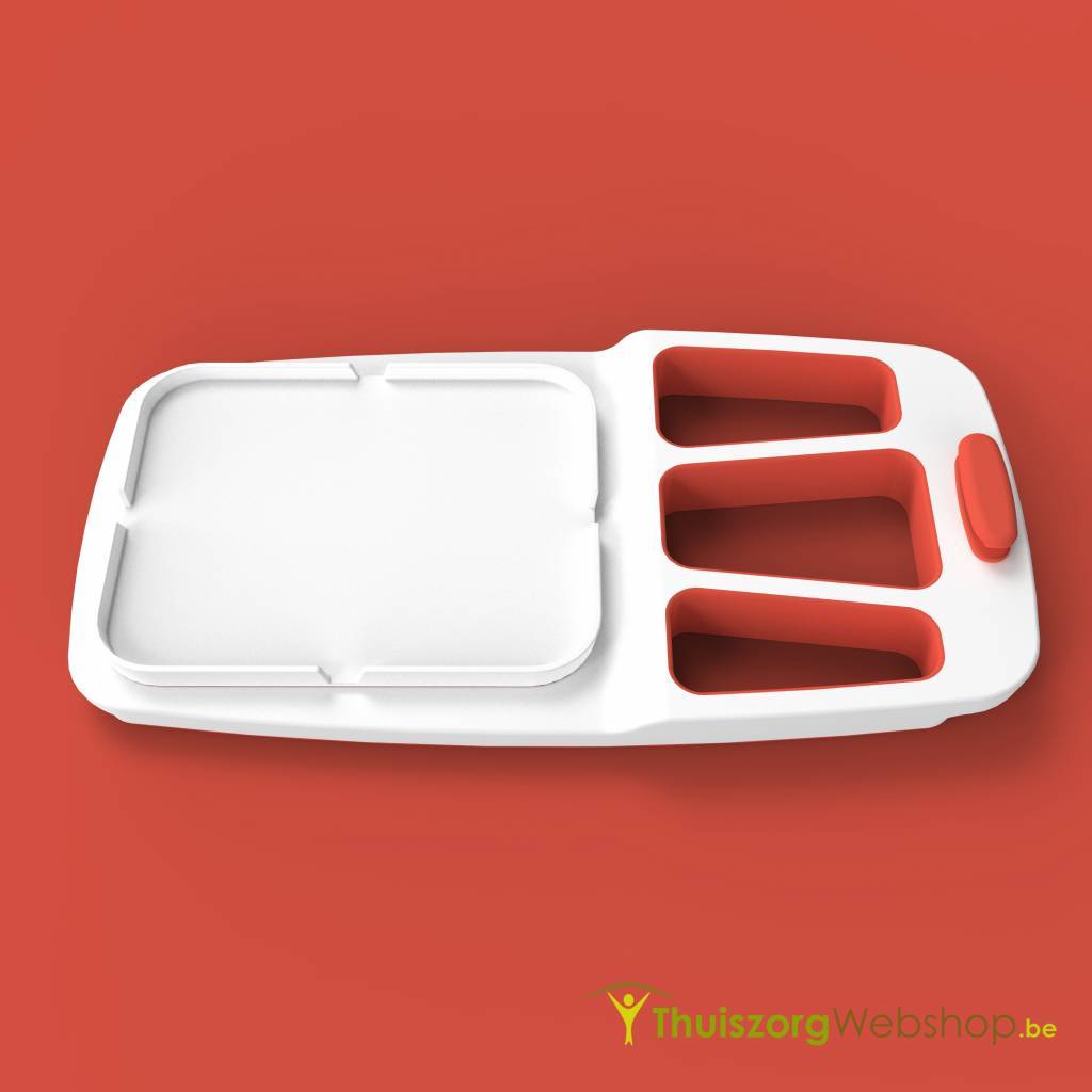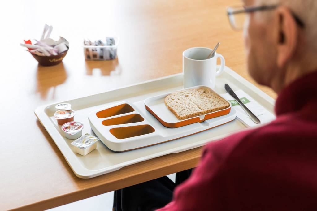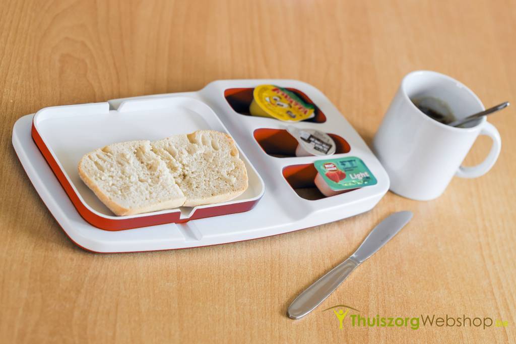 Theomatik de eenhandige boterhamplank zit slim in elkaar. Het eetbord heeft wigvormige inkepingen aan de zijkant, waar je van die kleine kuipjes boter, confituur of choco in kunt plaatsen. Schuif ze opzij, zodat ze klem zitten, en je kunt met één hand het lipje eraf trekken. Dan is er nog een rand waartegen je je boterham kunt klemmen zodat je kunt smeren zonder dat je boterham inclusief mes met Nutella over je plankje schuift zonder dat er iets blijft plakken. Een inkeping maakt het mogelijk zelfstandig je boterhammetje doormidden te snijden.