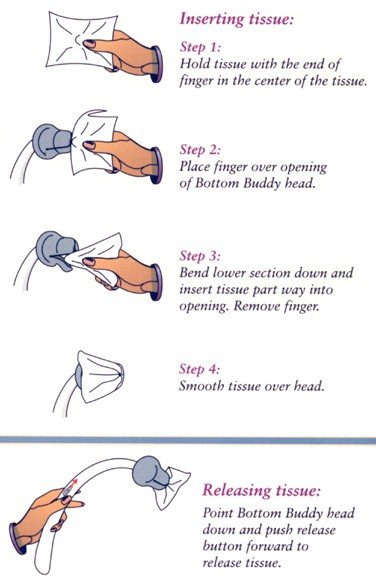 De intieme reiniger Bottom Buddy heeft een tulpvormige ronde kop, waarin het toiletpapier kan gefixeerd worden. Door een simpele druk op de knop wordt het papier na het reinigen losgelaten in het toilet. Door de speciale ronde vorm kan men vrij veel kracht zetten.Wordt geleverd met een waterdicht opbergzakje.