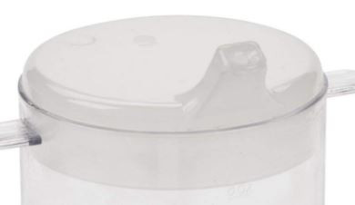 Zeer stabiele glasheldere drinkbeker met extra grote handvatten. Inclusief drinktuitje.