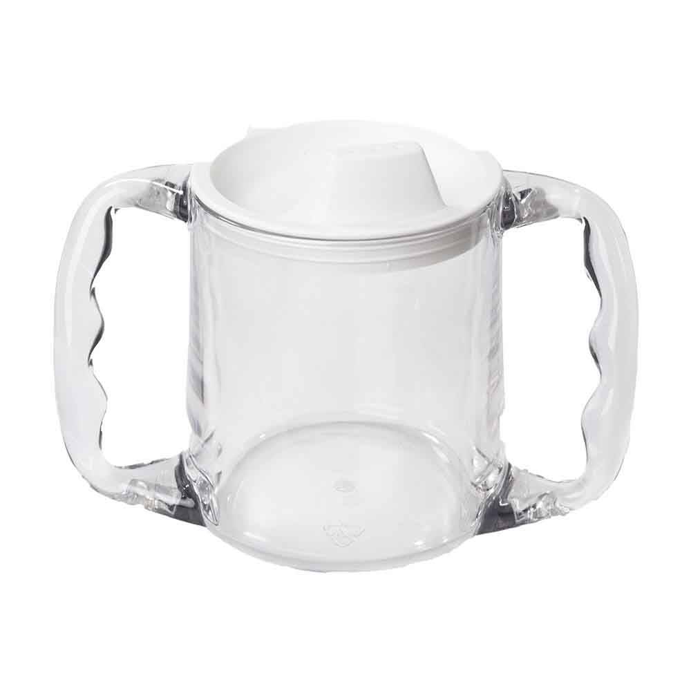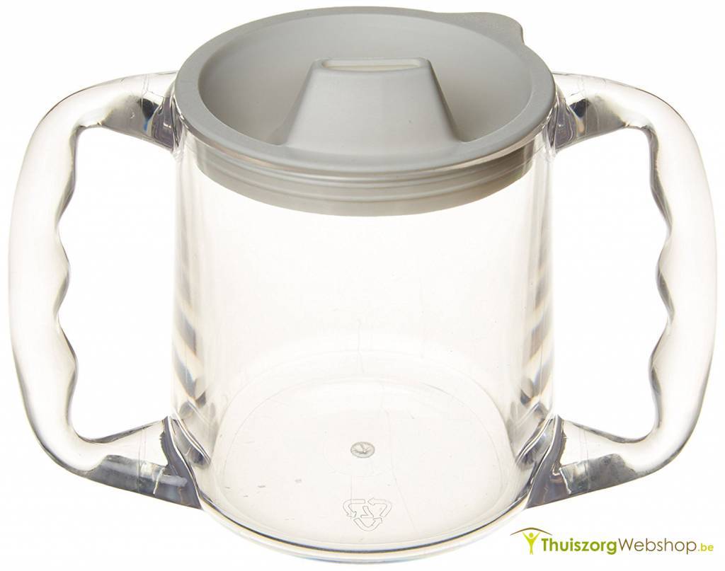Transparante beker met 2 grote handvatten en schuin tuitje, met een extra brede voet waardoor hij moeilijk omvalt.
