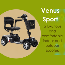 De Venus Sport is een luxueuze en comfortabele binnen- en buitenscooter. Dankzij de draaibare stoel en de wegklapbare armsteunen kan een transfer vlot worden uitgevoerd.
