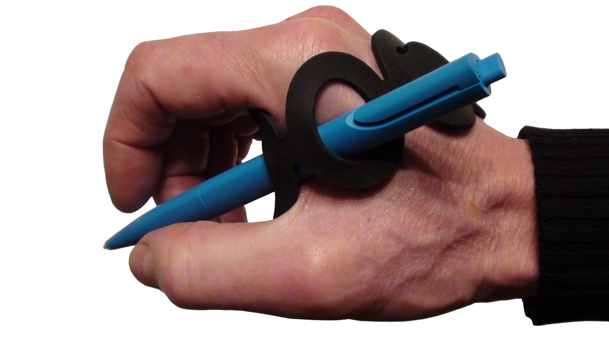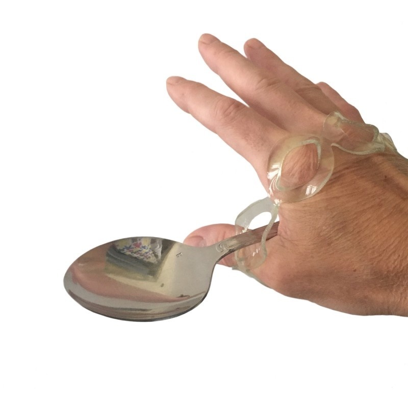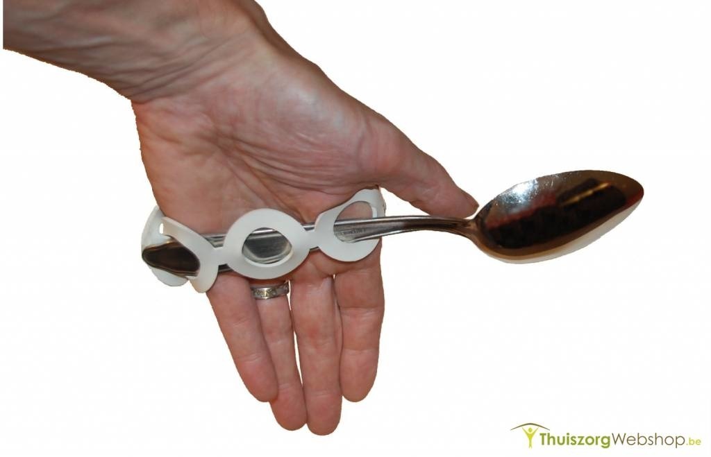 Men kan ook 2 of 3 verdikkingen na elkaar steken of de verdikkingen verzwaren met metalen kogeltjes, bv. voor personen met Parkinson of tremor. Combineerbaar met Gripofix om bestek, tandenborstel en schrijfgerei te fixeren aan de hand.