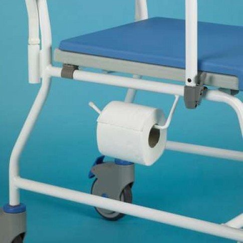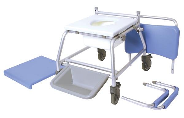 Douche- en toiletstoelcombinatie, volledig geconcipieerd tegen roestvorming en gemakkelijk uit elkaar te nemen. Het frame is gemaakt uit staal met een plastic laag. De armleuningen zijn wegklapbaar voor gemakkelijke transfers en ook de zitting kan gemakkelijk weggenomen worden. Standaard worden een grote vierkante witte toiletemmer en zitkussen meegeleverd.