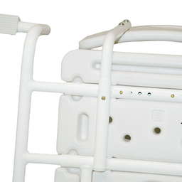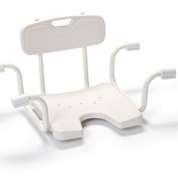 Badzit met uitsparing die op de rand van het bad hangt. De witte kunststof zitting is bevestigd op een aluminium kader. De uiteinden van het frame zijn bedekt met antislip doppen die het bad niet beschadigen.